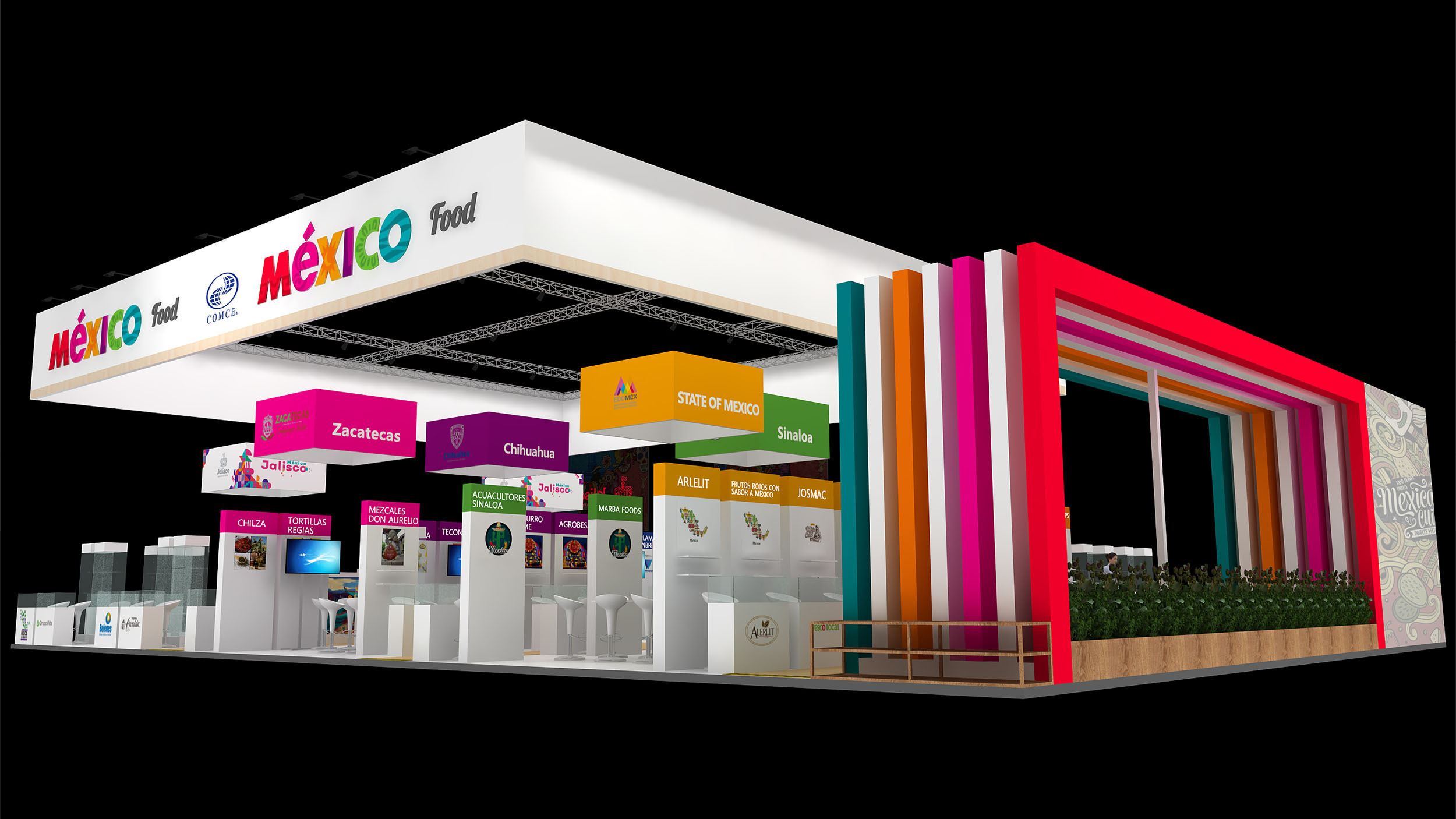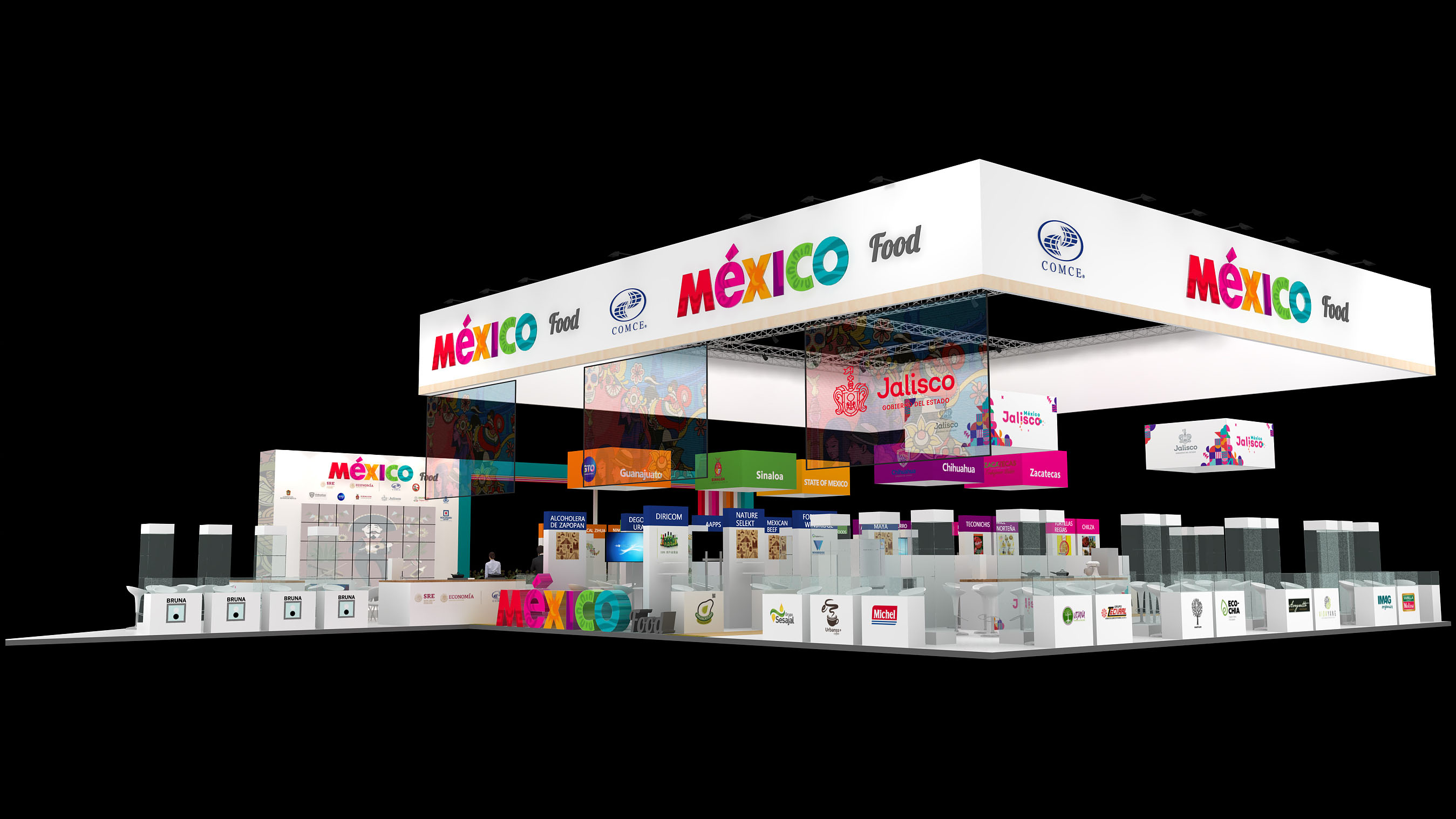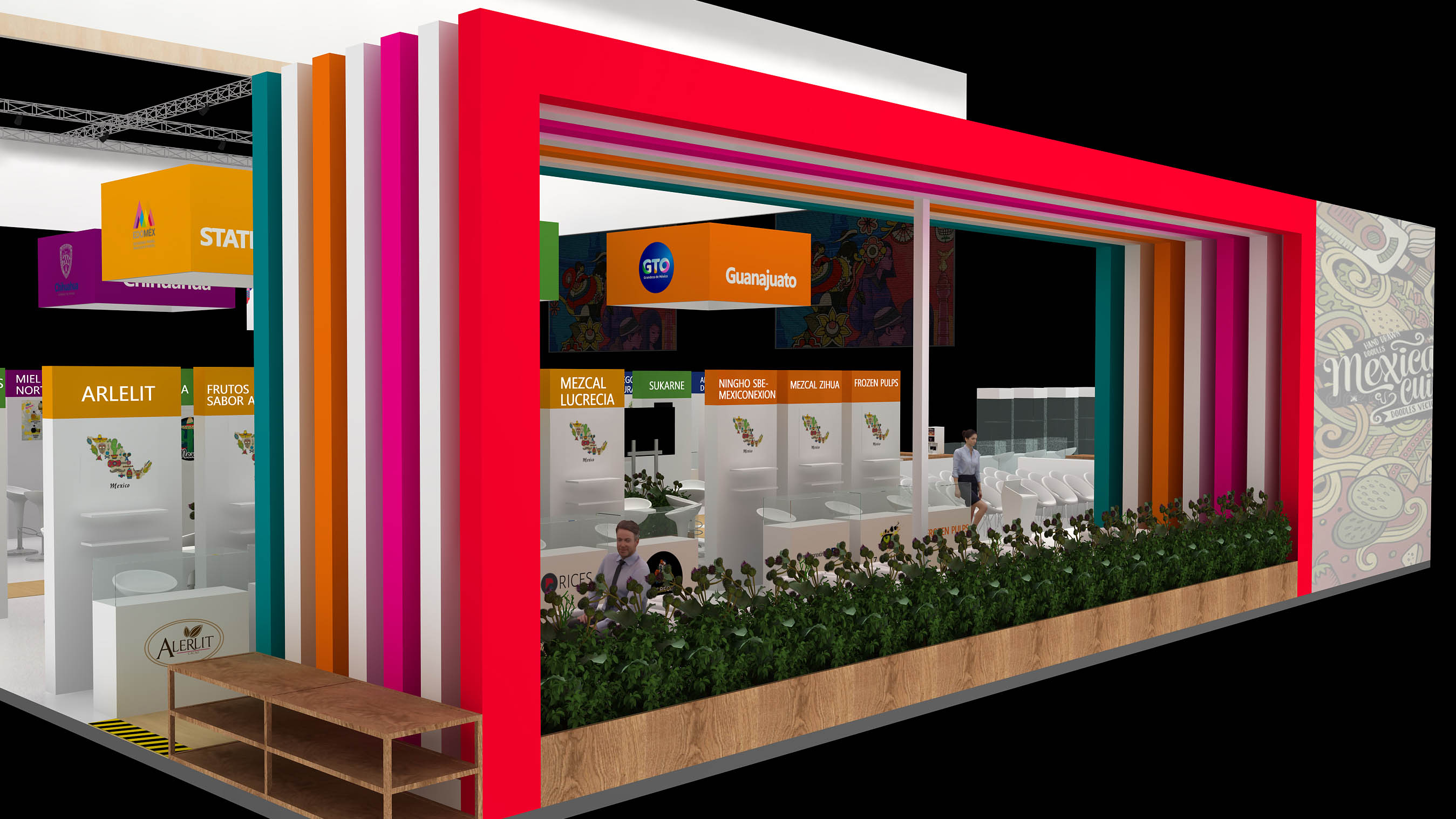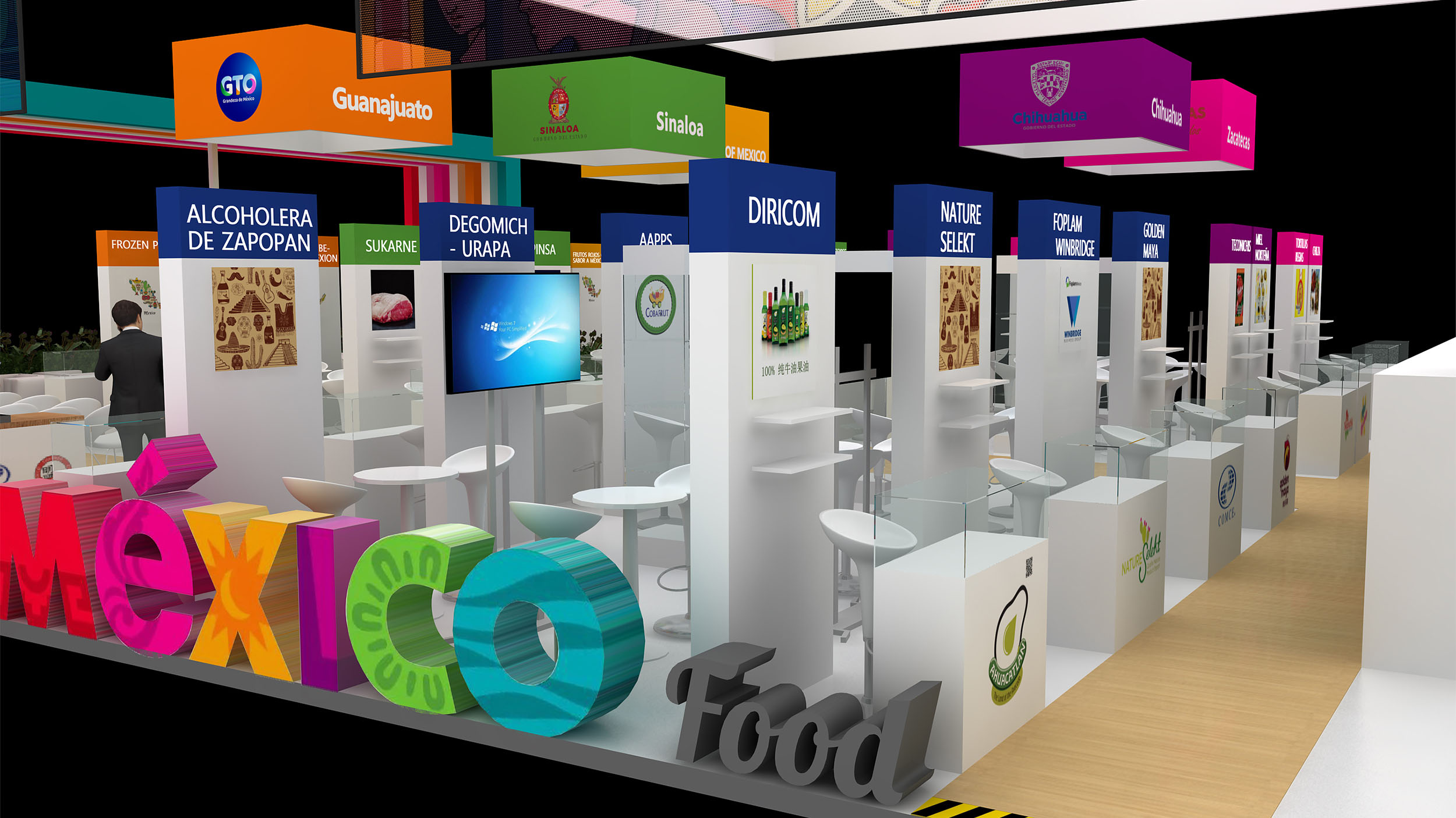 墨西哥展臺設(shè)計為四面開放,鼓勵參觀者更自由的進(jìn)出,整個展臺由450平米組成,功能區(qū)上分為3大展區(qū);其中100平米的農(nóng)產(chǎn)品展區(qū);250平方米的食品展區(qū)和100平米的公共活動展區(qū)。農(nóng)產(chǎn)品展區(qū)和食品展區(qū)共計48家參展企業(yè)均設(shè)有獨(dú)立的展覽區(qū)域(帶有儲物功能的咨詢桌,宣傳海報,資料架,部分玻璃展柜)。每個區(qū)域滿足所屬產(chǎn)業(yè)領(lǐng)域的參展企業(yè),用來展示展品或者形象,讓觀眾能夠很明顯的區(qū)分出墨西哥在各個產(chǎn)業(yè)領(lǐng)域的展出內(nèi)容,將墨西哥的精彩與世界共享。